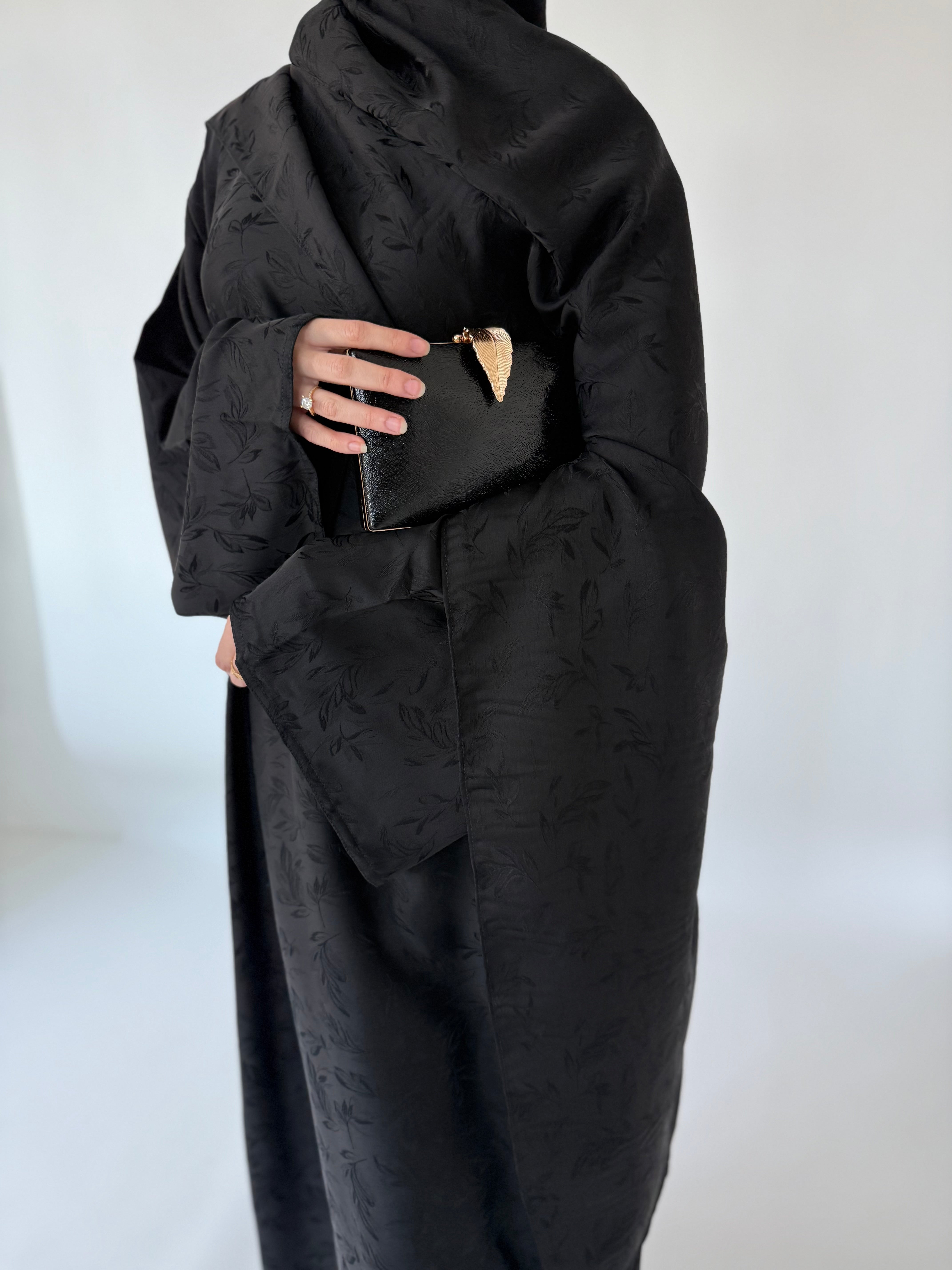 Feel like a fashionista and secure your upcoming events with this stylish shimmering set, made with wide sleeves, a luxurious printed abayah and matching wide hijaab made to cover you modestly!