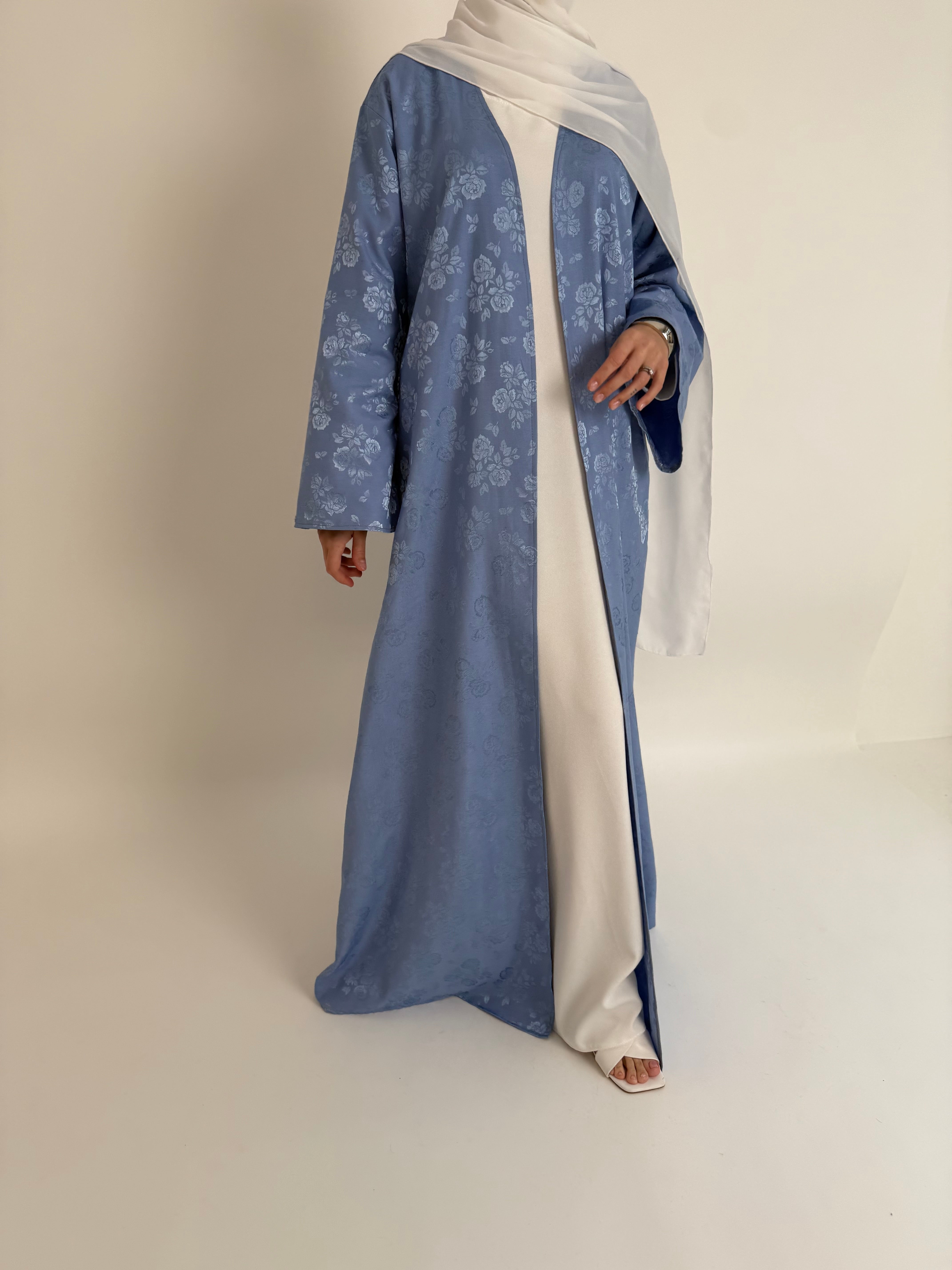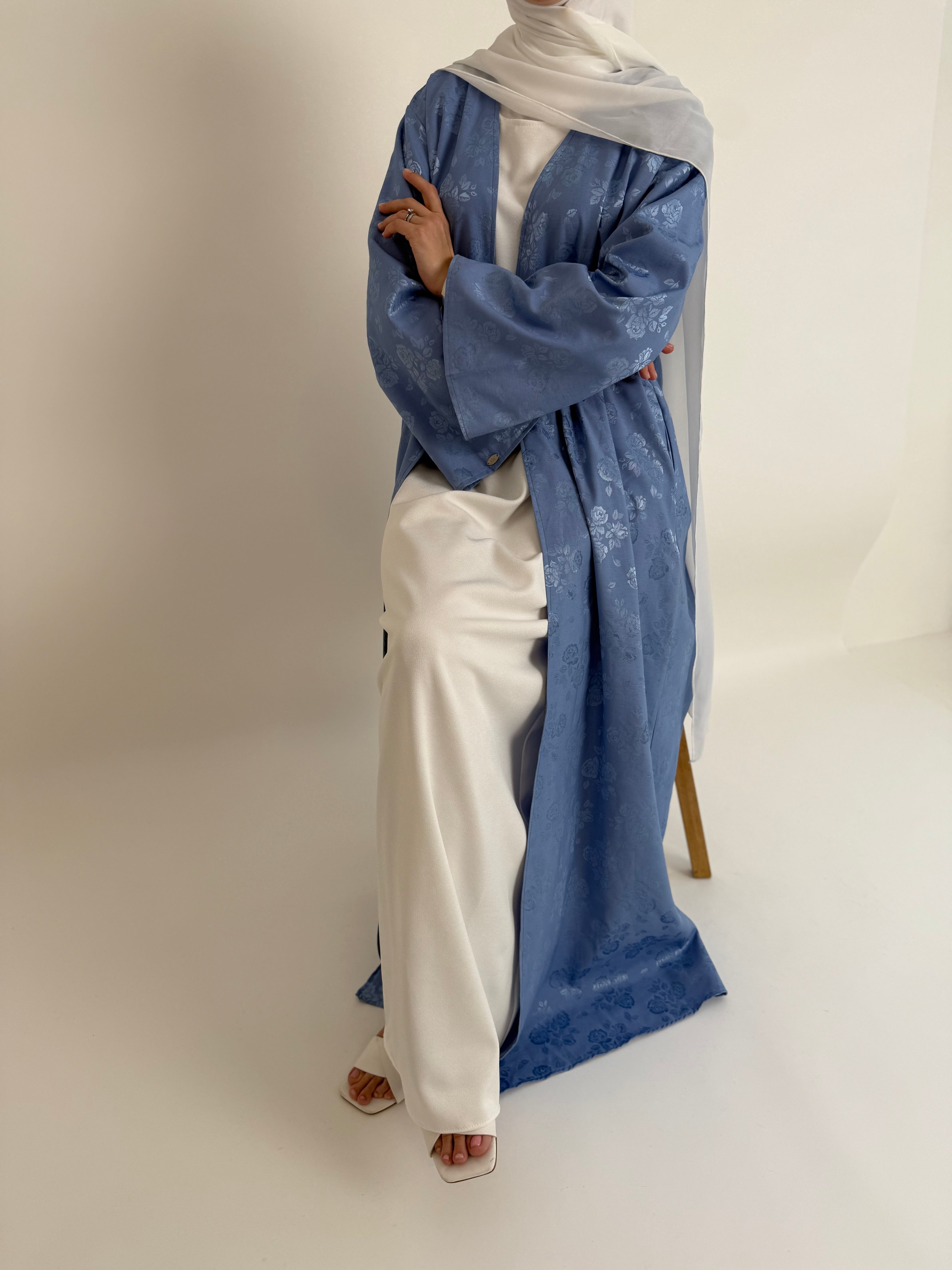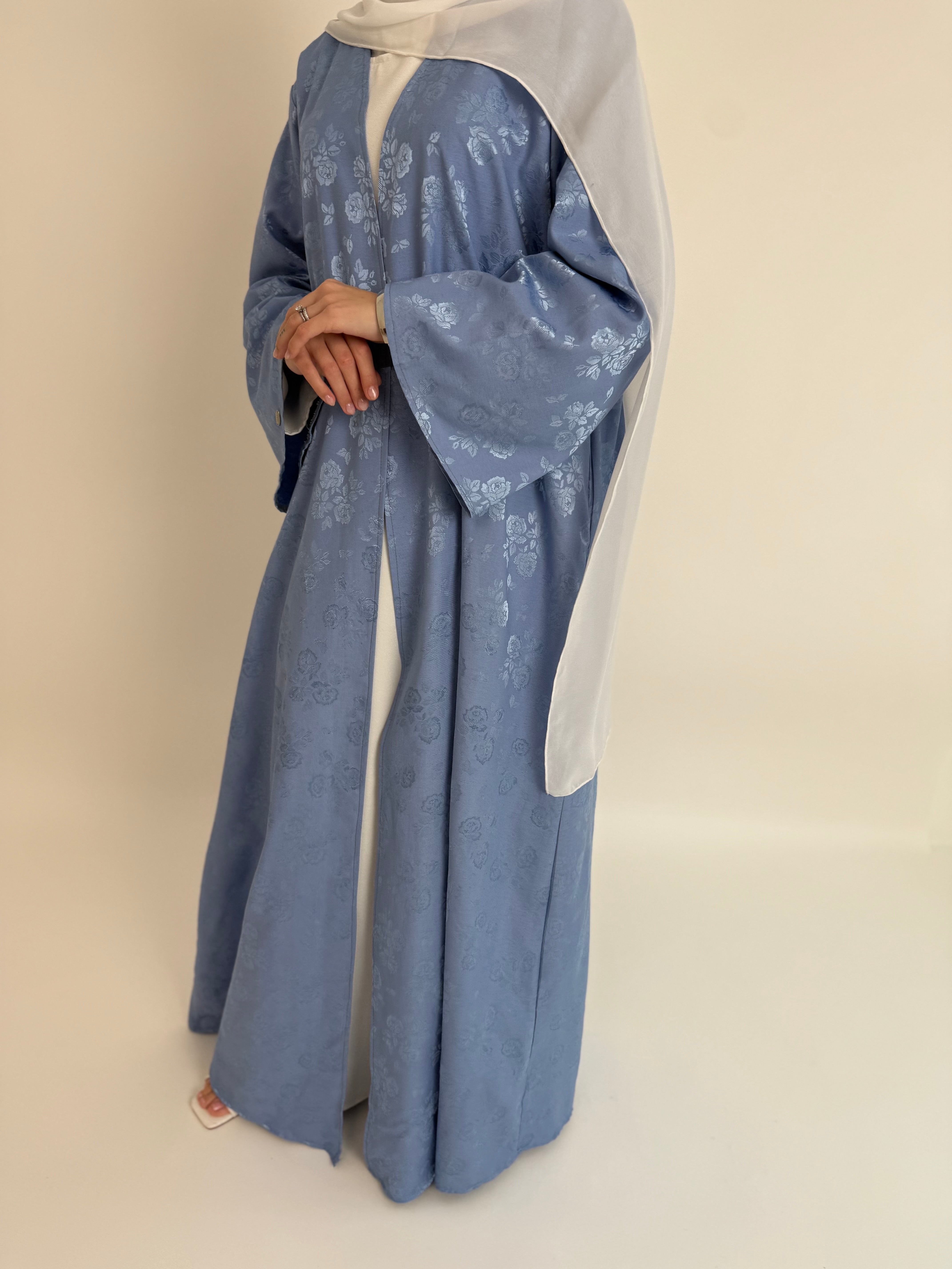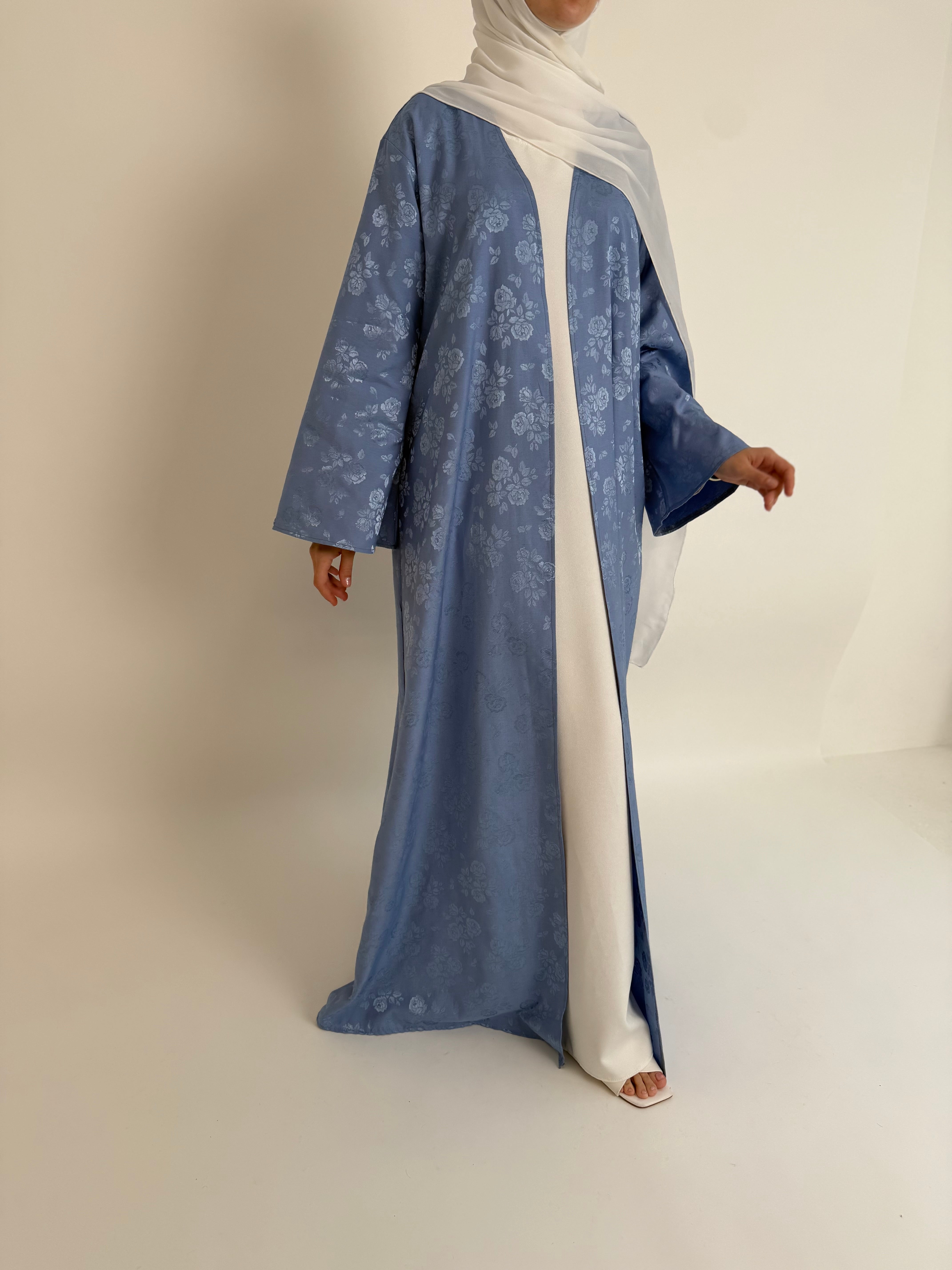 Features: Open printed abayah with a premium inner long sleeve dress, matching wide chiffon hijaab and matching belt.