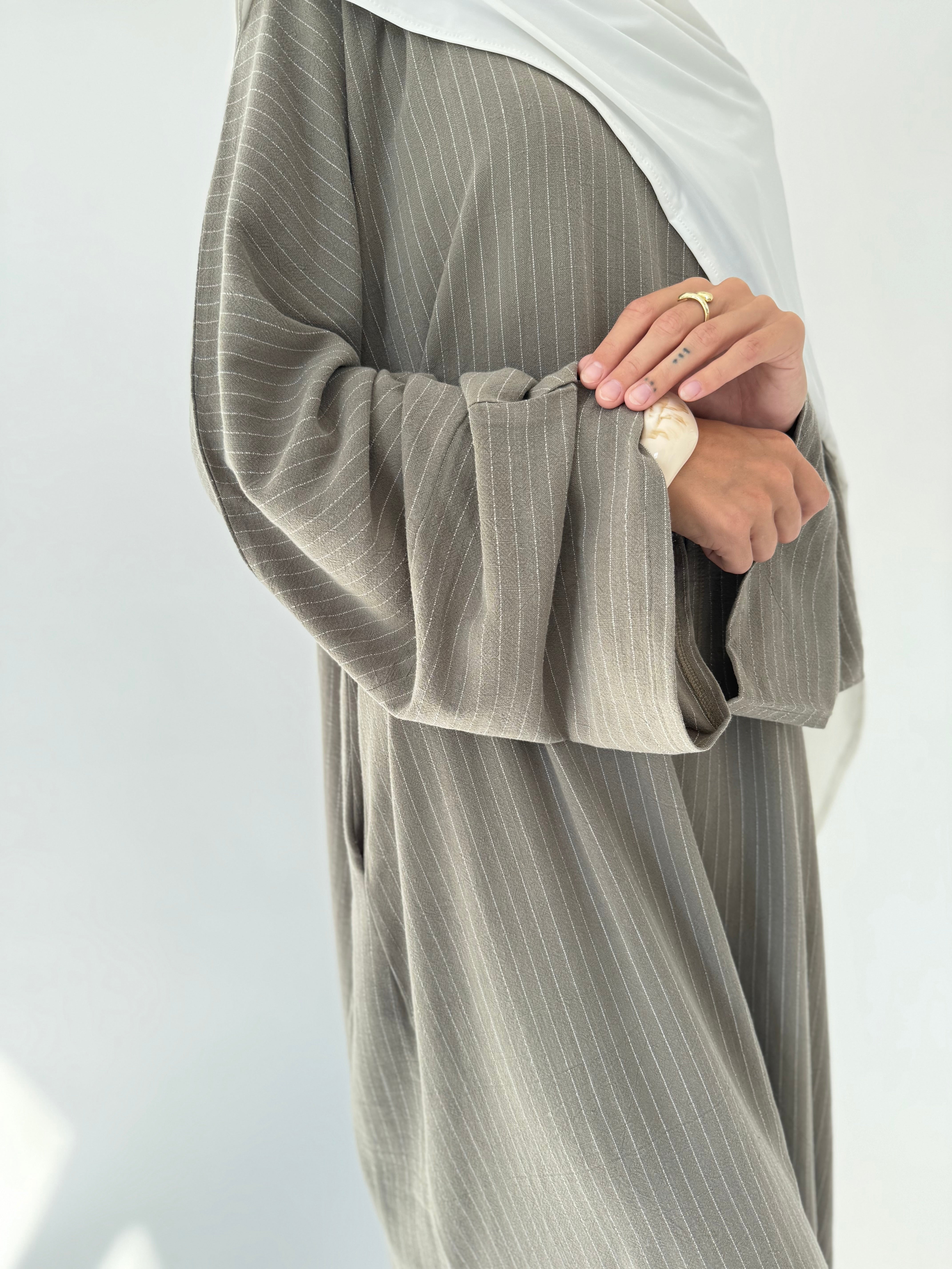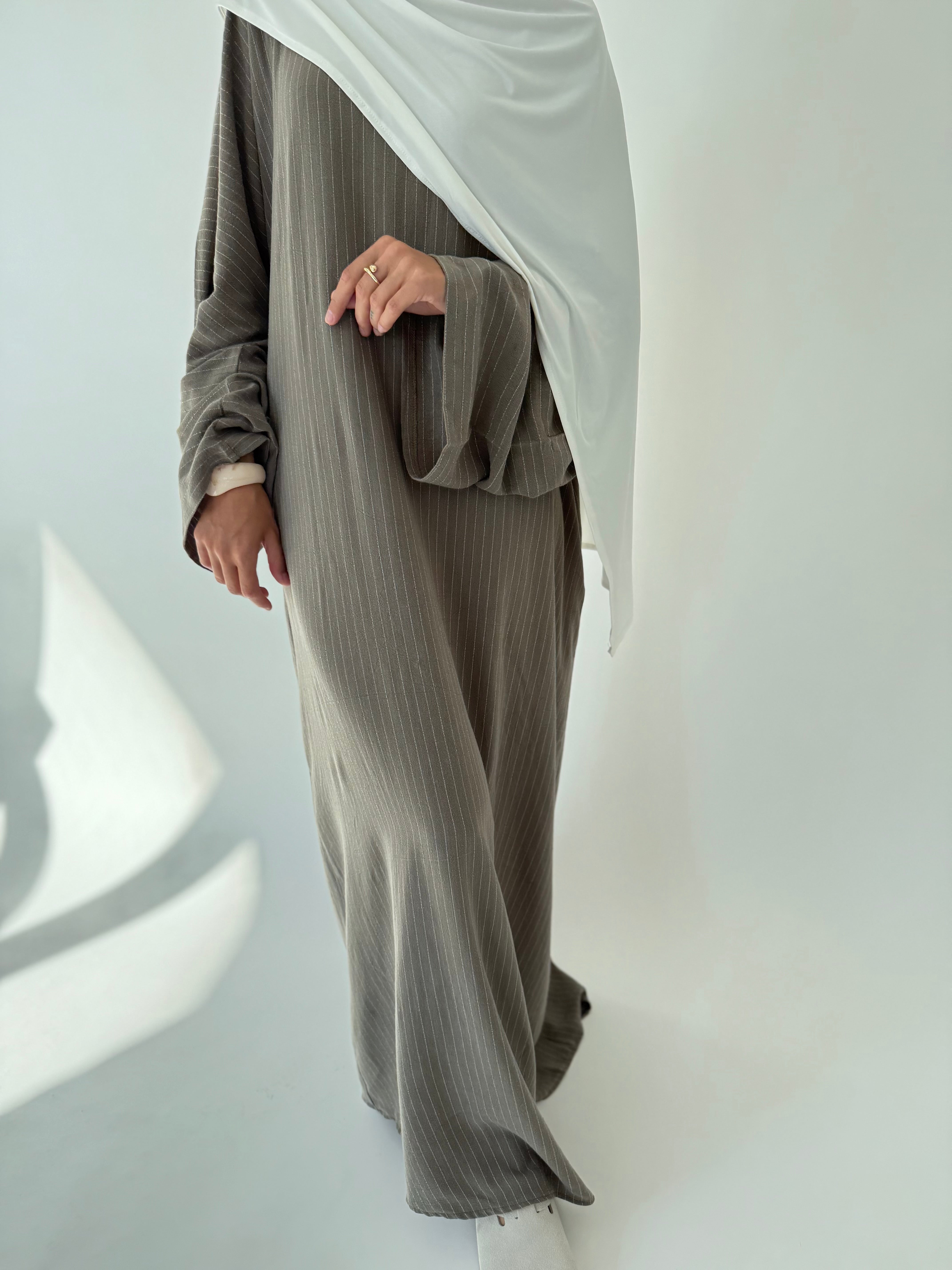 Our Linen abayah comes in a beautiful striped khaki shade, made from weighted linen, to give you quality fabric without the need to layer! With stylish wide sleeves, this abayah is the ultimate piece for our natural-fibre lovers, to allow your body to breath this Summer!