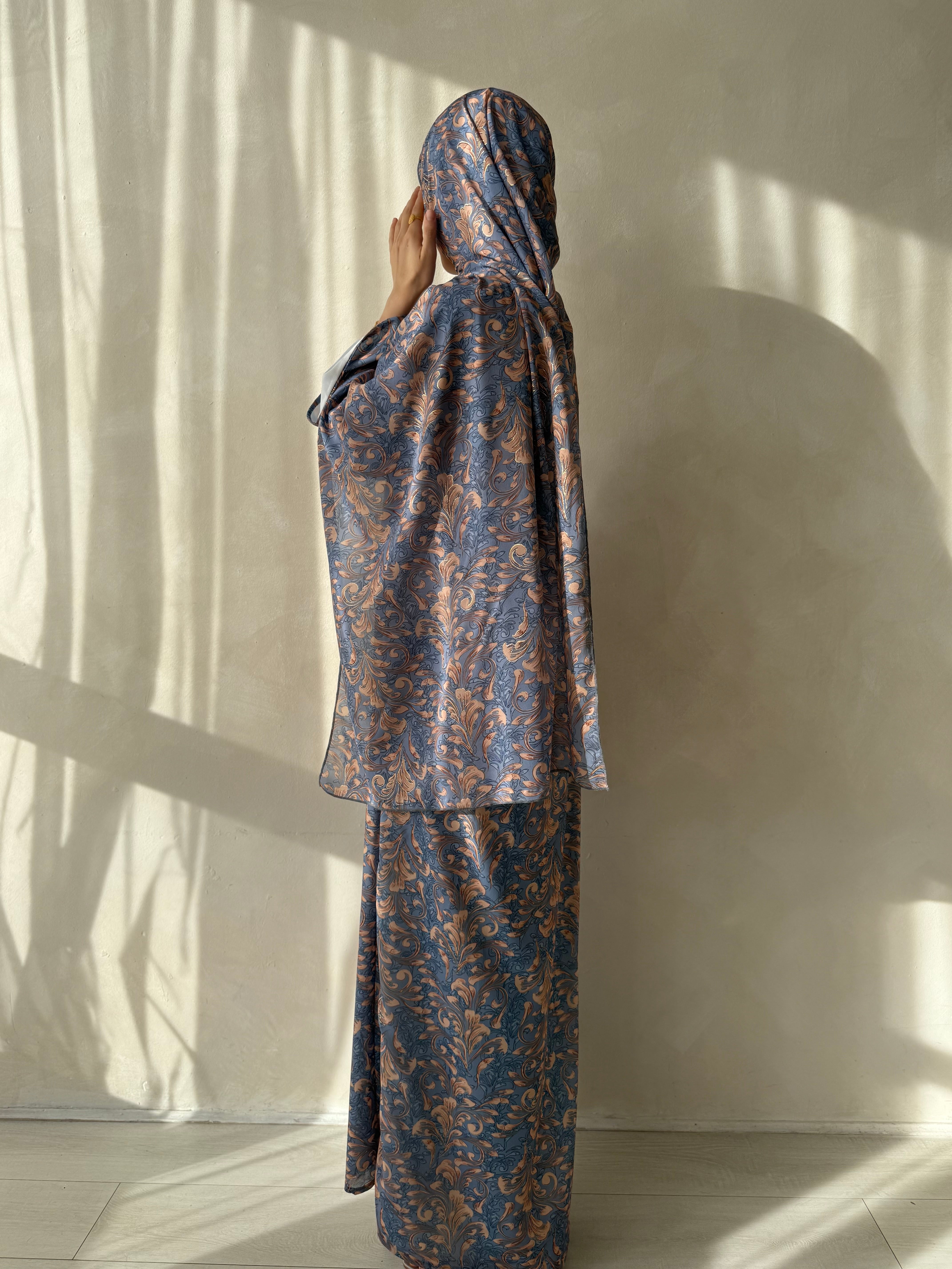 This Eid feel like a princess and embrace Eid with this stylish set made with wide sleeves, luxurious printed abayah and matching hijaab made to cover you modestly!