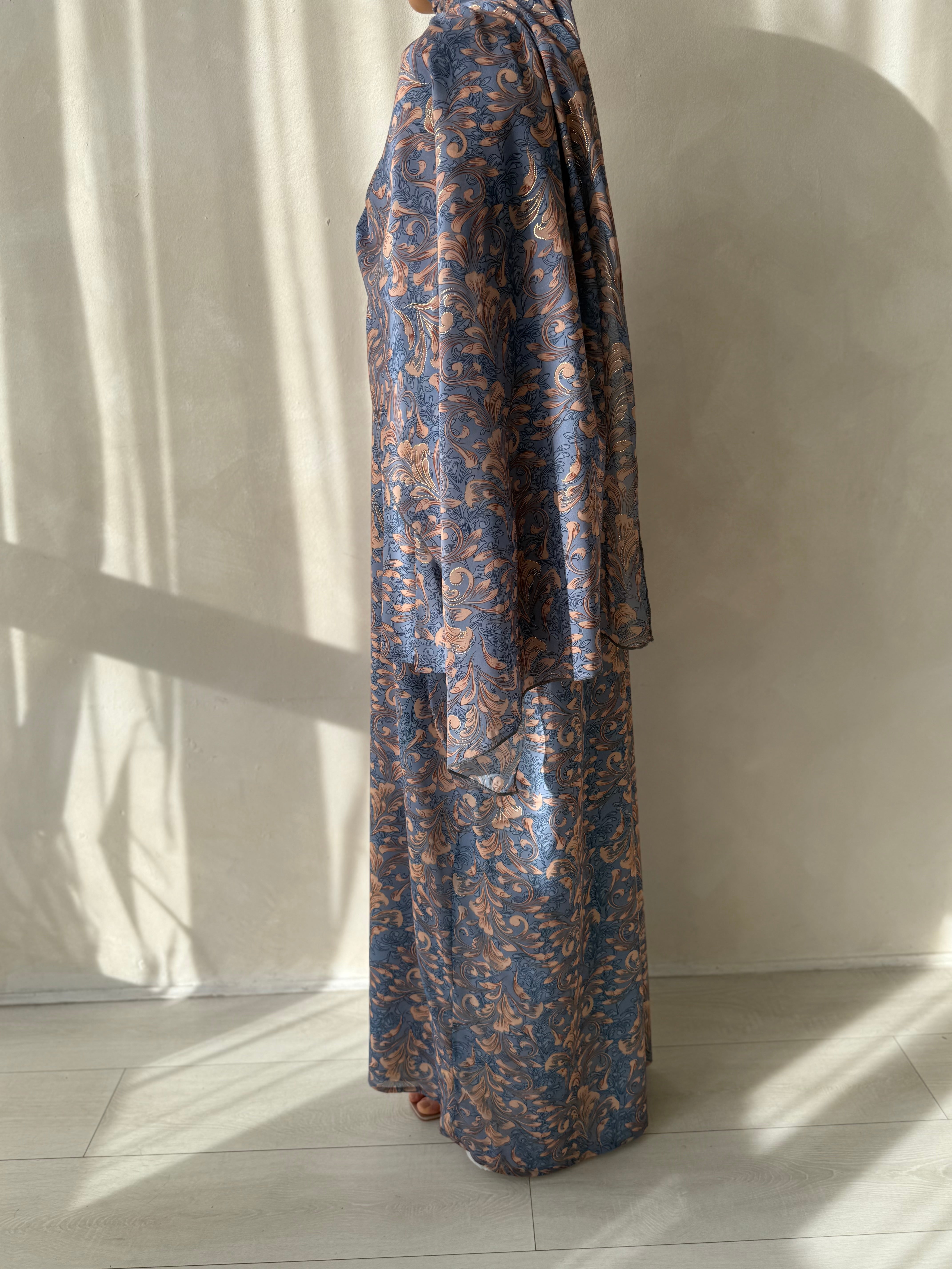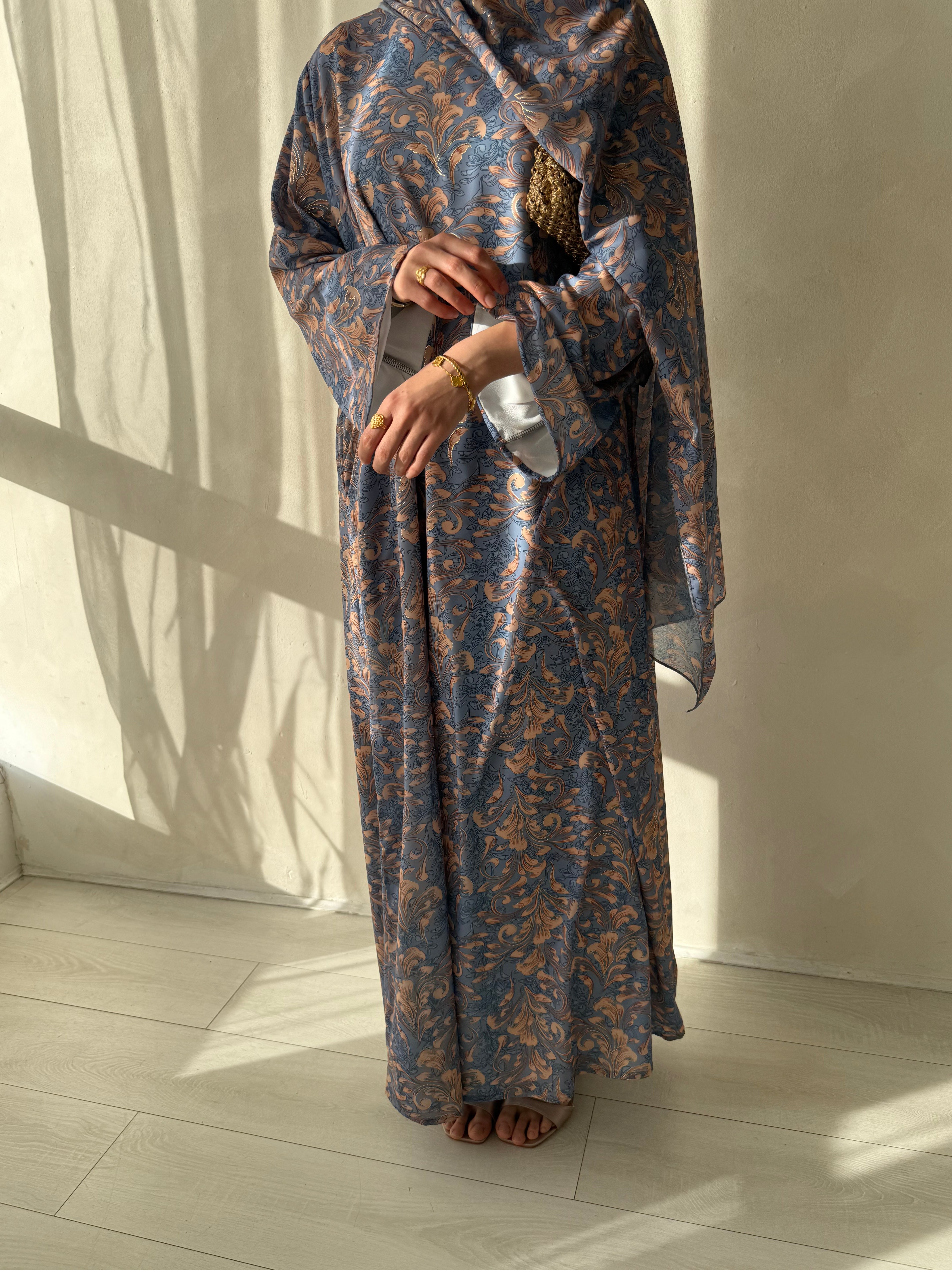 Features: Closed printed abayah which is fully lined, matching wide chiffon hijaab, hidden pockets and matching belt.