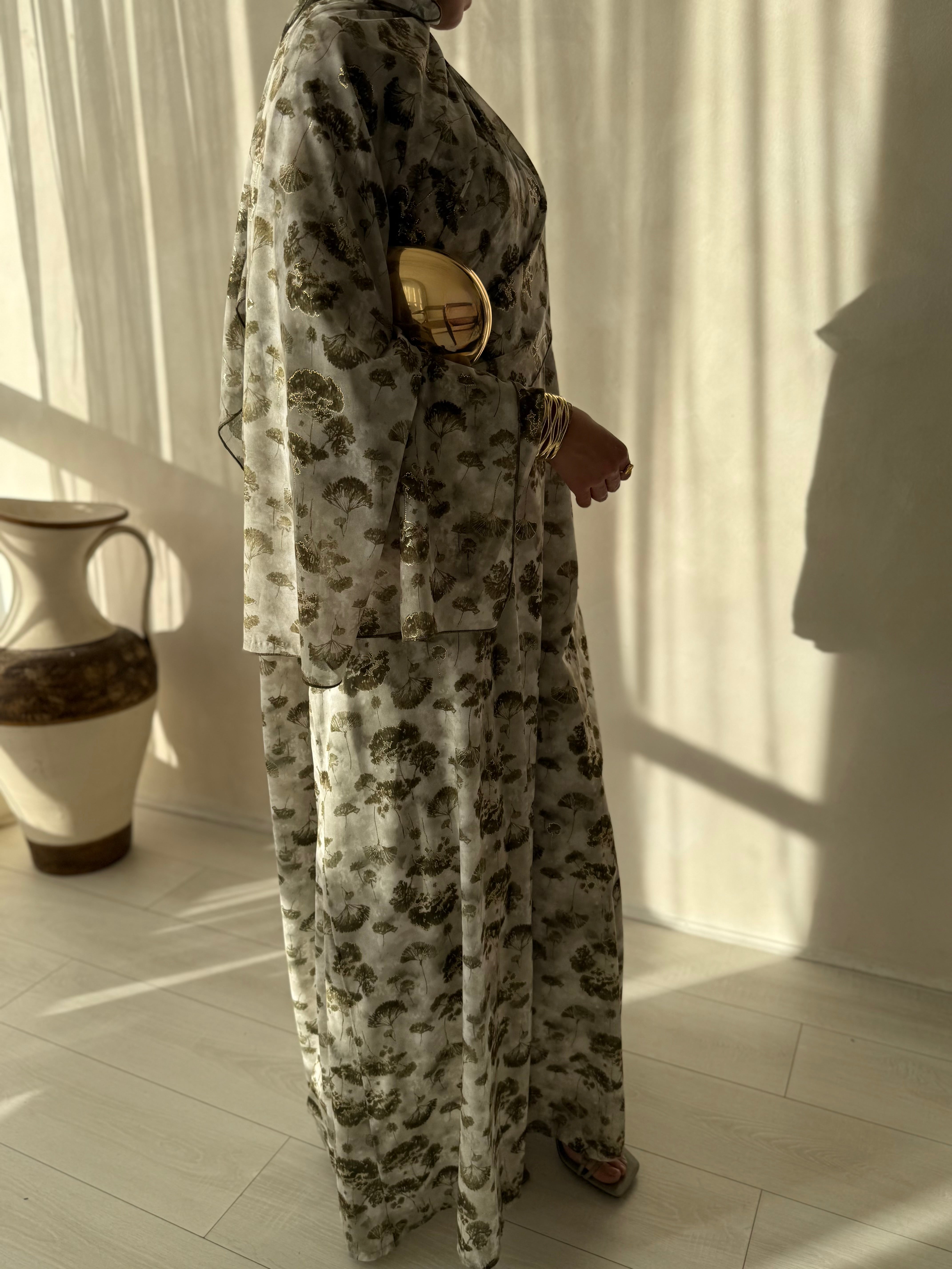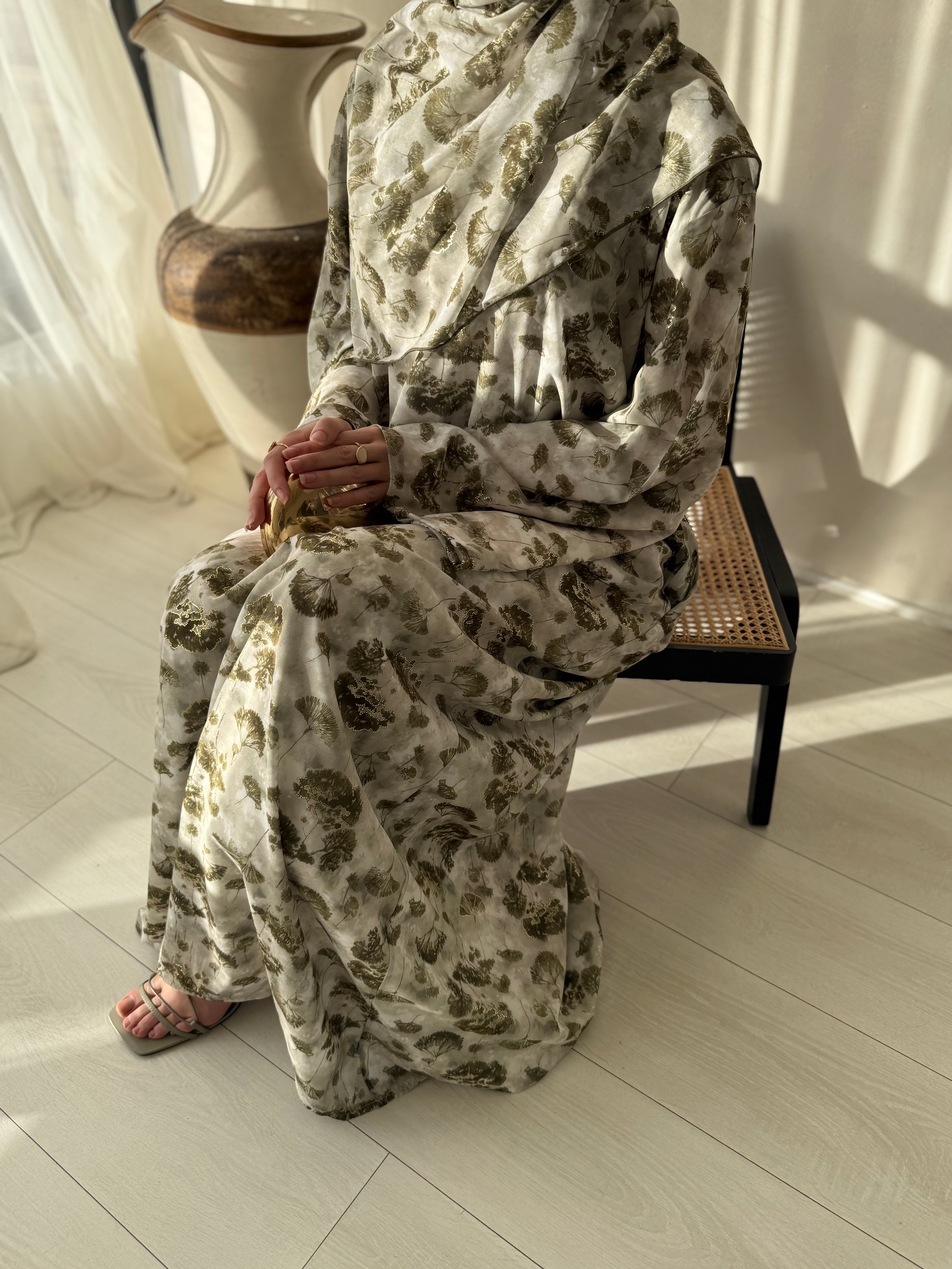 Features: Closed printed abayah which is fully lined, matching wide chiffon hijaab, hidden pockets and matching belt.