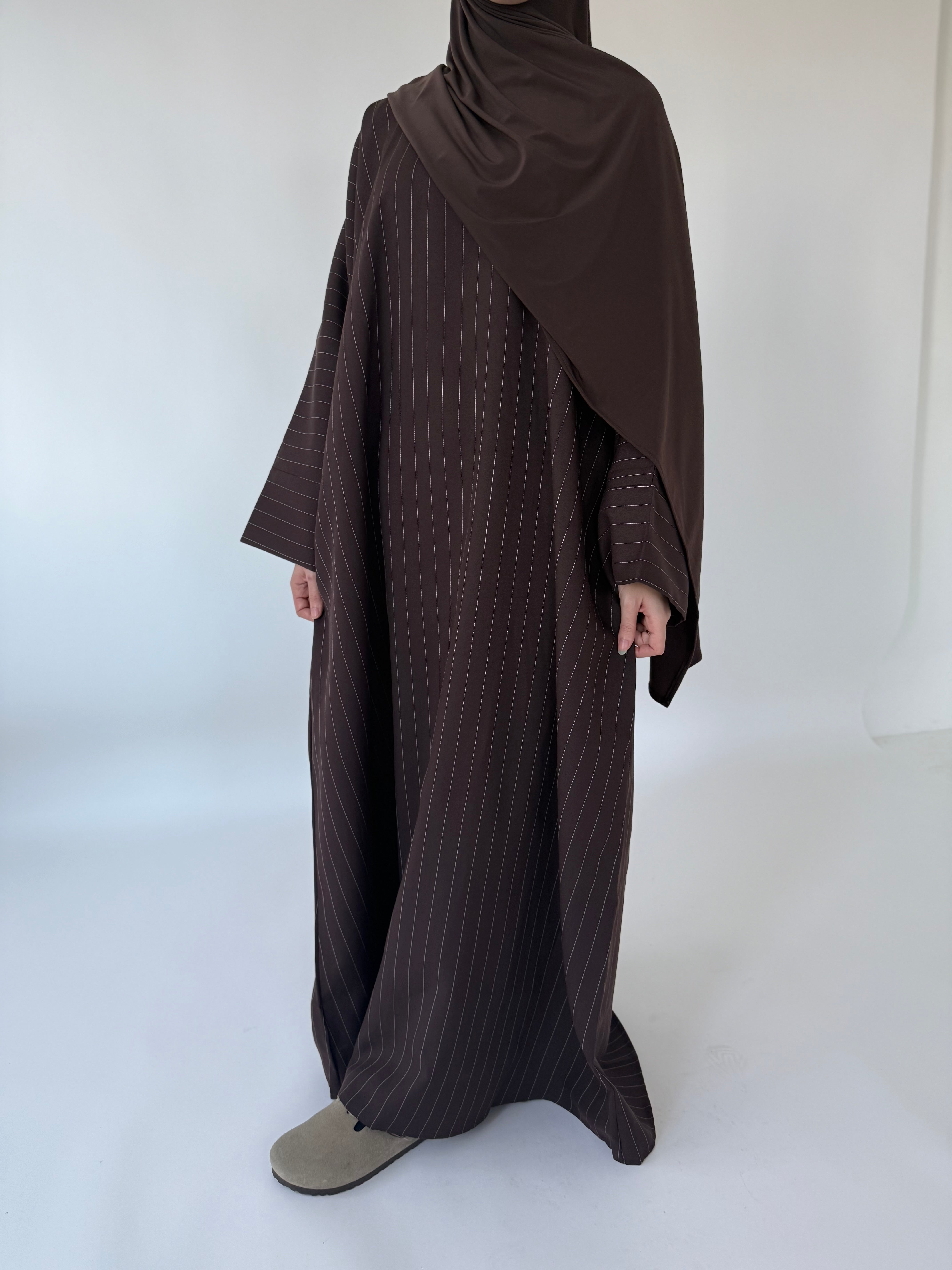 Our Walnut Stripe abayah offers sophistication and style when you dress the winter. Its pinstripe pattern provides a perfect outfit not only for work and office use, but also great for occasions.